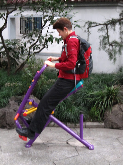 The parks we visited in the French Concession were particularly interesting. First we'll show you a small park with great charm and all sorts of exercise equipment that so many senior citizens were making good use of that we had to hop on ourselves. Do take time to read the park rules -- a few of them are quite a hoot.