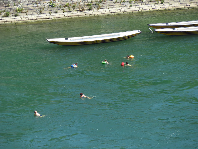 The next day we came down to the Rhine in the center of town and got a closer look at these floating pillow people. Near as we could figure out, they were folks who purchased a dry bag such as kayakers and canoeists use for spare dry clothes, and they put some shoes and maybe a few items of clothing in them, closed them up with as much air as possible, then used them as flotation devices. When they get downstream they either walk back upstream -- we saw quite a few people doing just that -- or maybe take a tram to go home or to go do it again. And then there's the guy who was making a cell phone call while drifting down the river, and the woman who played fetch with a tennis ball with her dog as both glided past us. What a hoot!